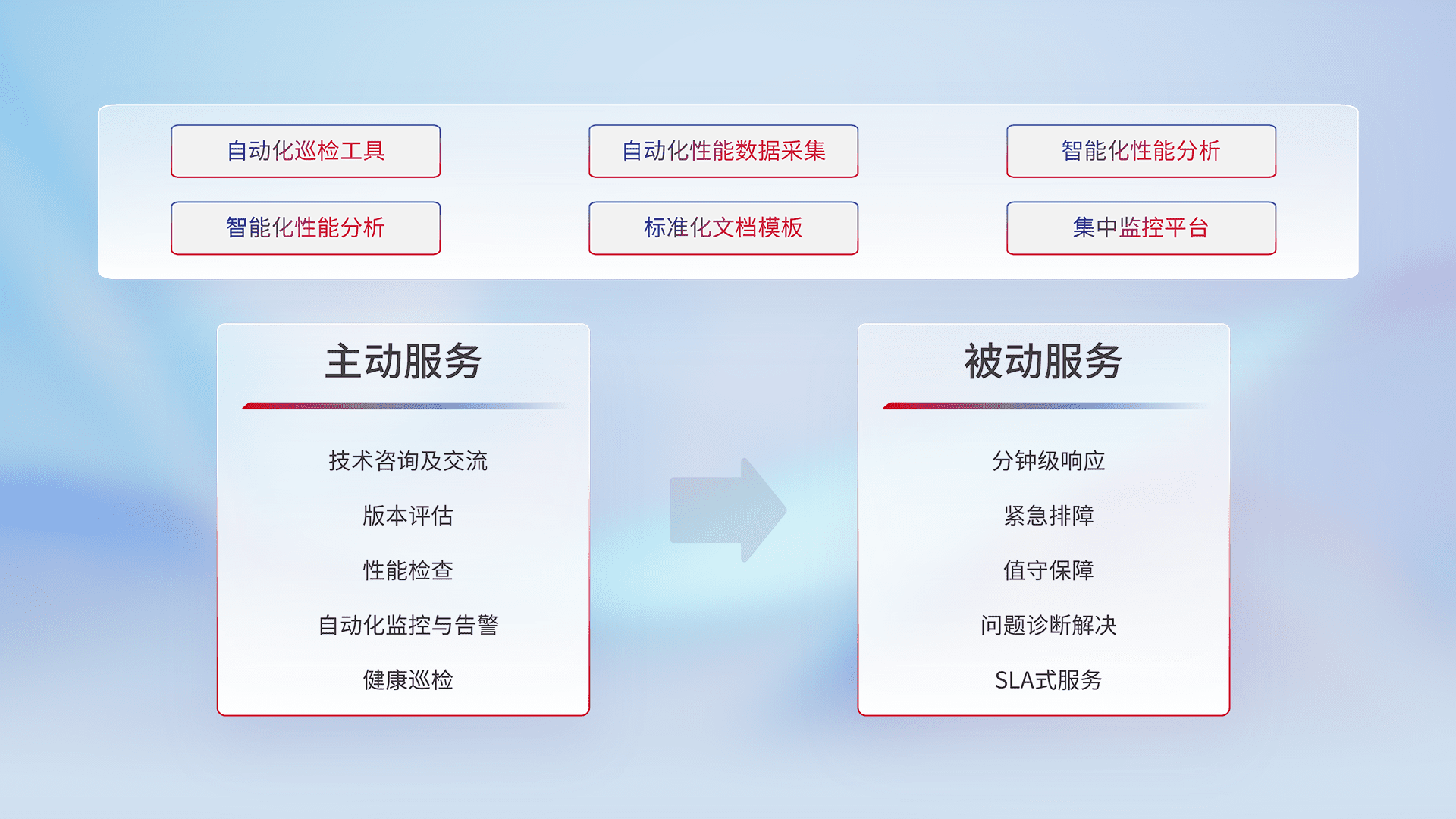 智能化工具和标准化文档,,,保障服务质量,,,提供主动服务(包含技术咨询、、、、版本评估、、性能检查、、、、自动化监控与告警、、健康巡检)和被动服务包含(分钟级响应、、、紧急排障、、、值守保障、、问题诊断解决、、、SLA服务)。。。。